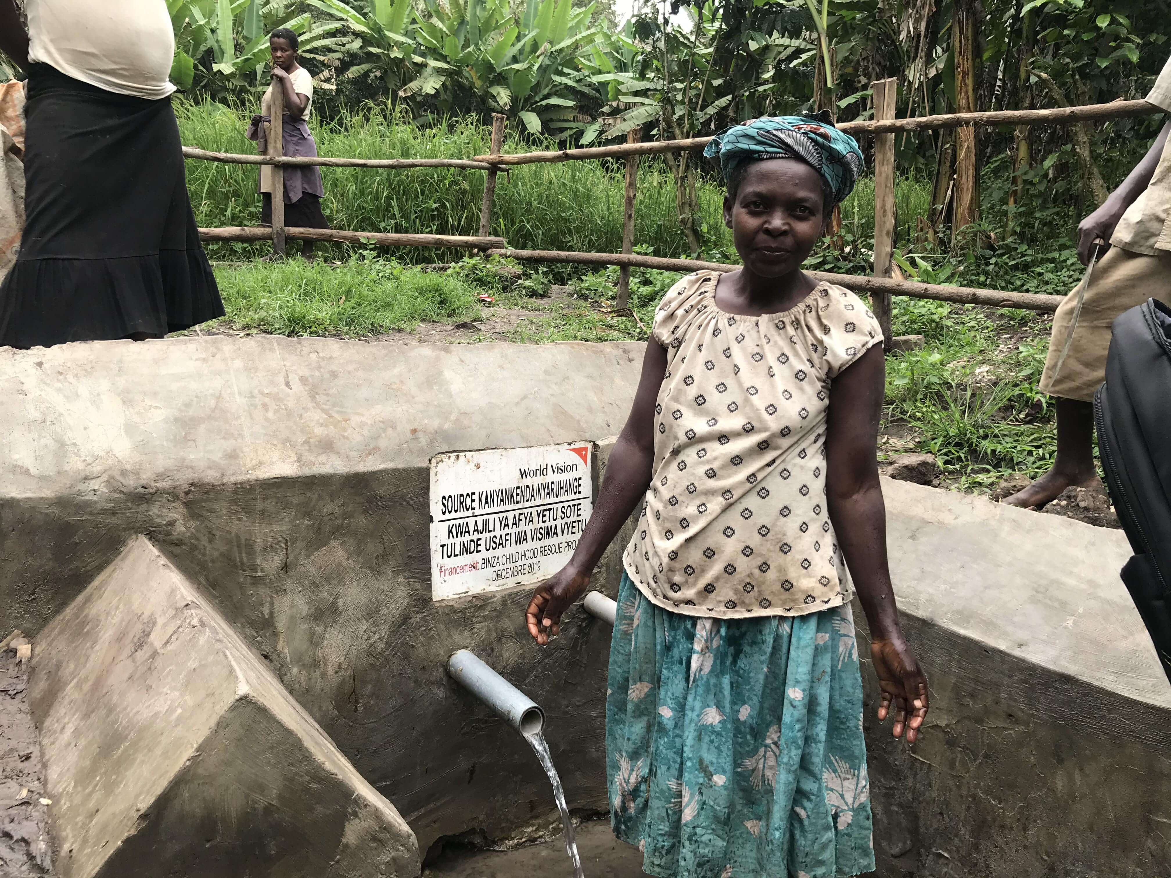 A woman stands in a newly constructed spring. 16 water springs were completed in 2020.