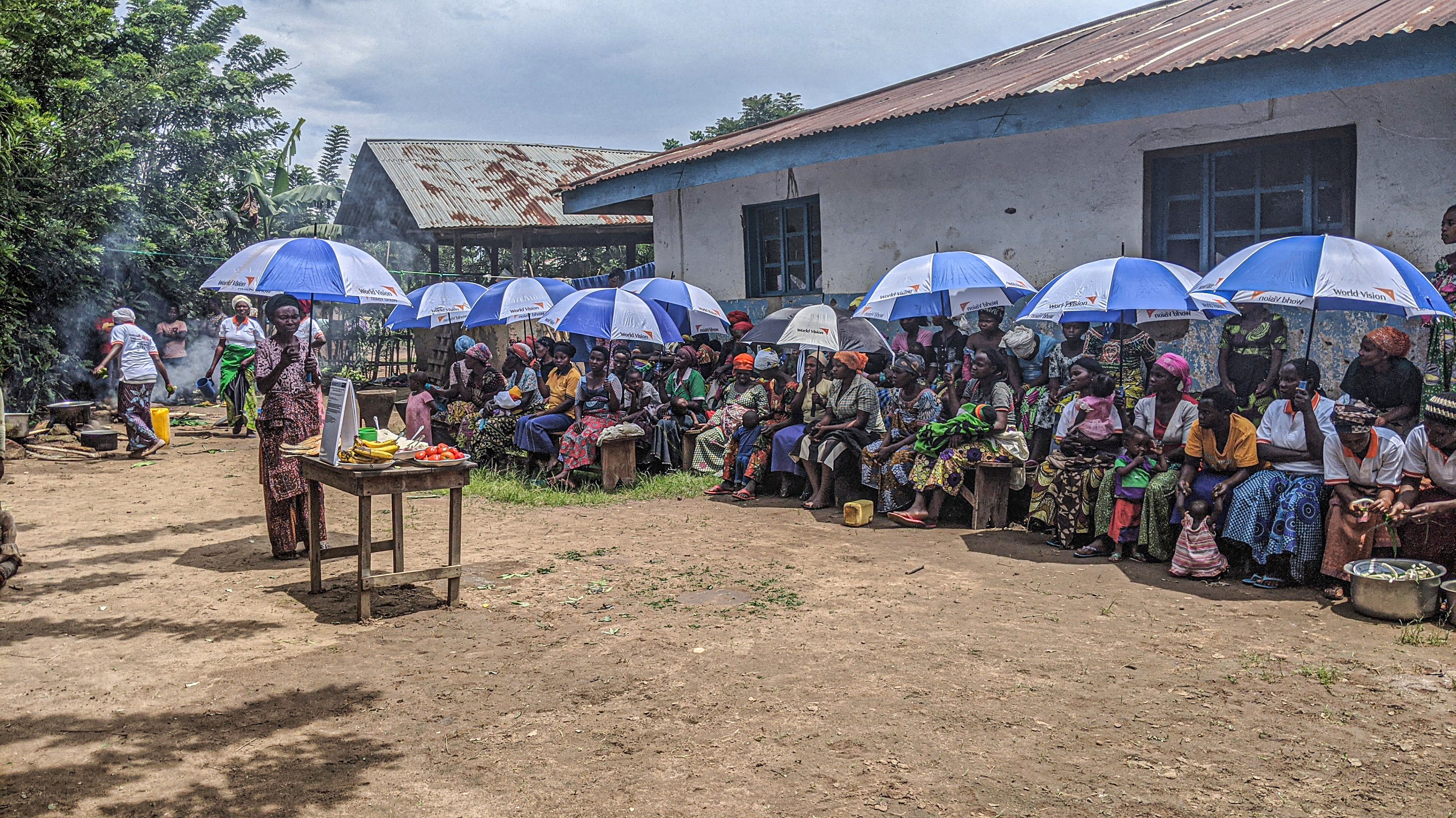 Mothers come together in the fight against child malnutrition. Seen here, (mostly) mothers learn how to mix and choose foods available at the local market, ensuring they can prepare and cook balanced meals to improve the health of children.