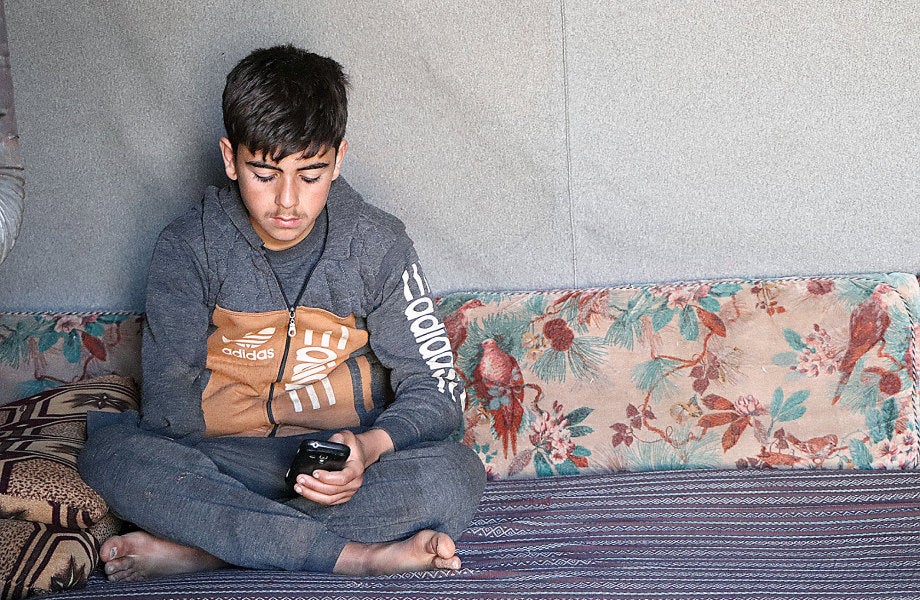 Fadi lived with his family in what was his grandparents’ home before the airstrikes. After their house was destroyed, they made their way to an overcrowded displacement camp north of the city, where he and his family made their home in a tent. “We are new here, and we don’t know anyone,” says Fadi, now 15.