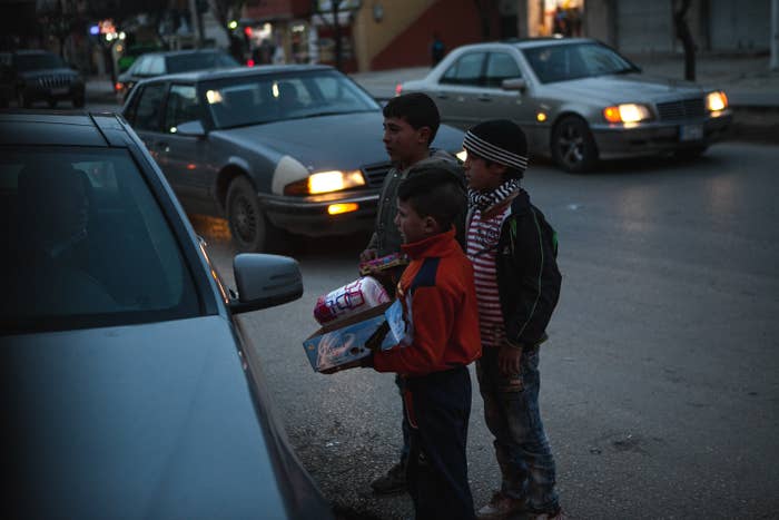 Young Syrian refugee boys sell household items on the street to assist their families with rent and basic essentials.